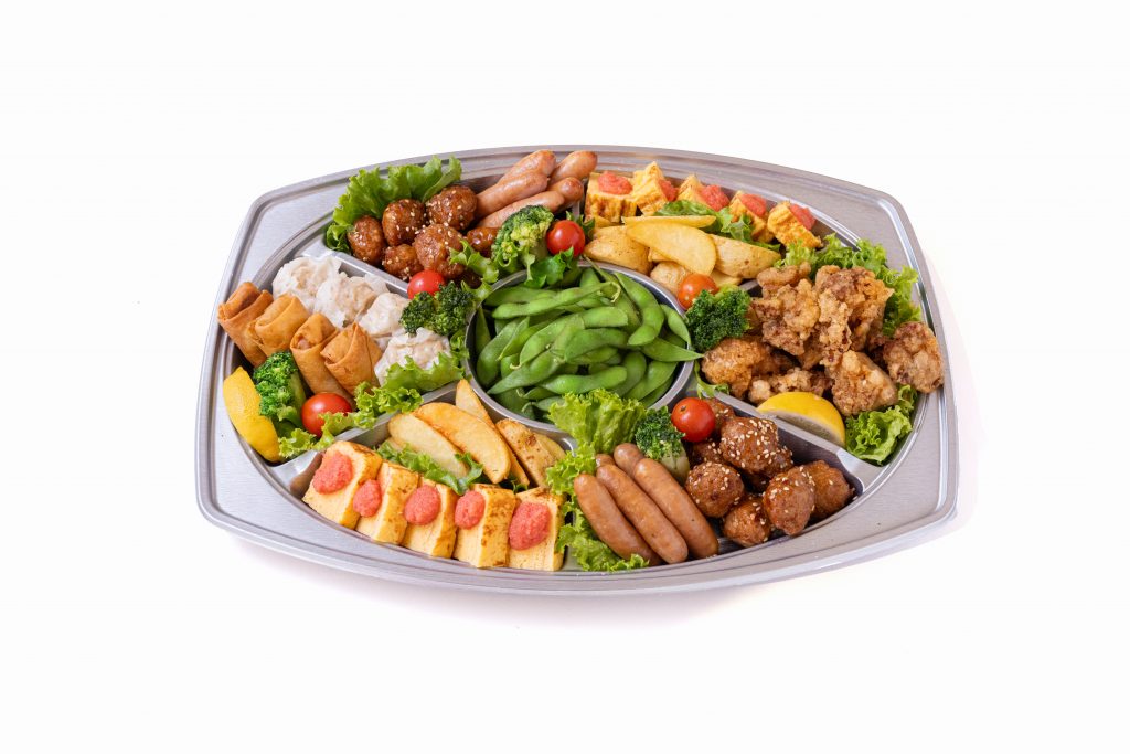 明太玉子焼き、唐揚げ、焼売、春巻き、肉団子、ウインナー、フライドポテト、ミニトマト