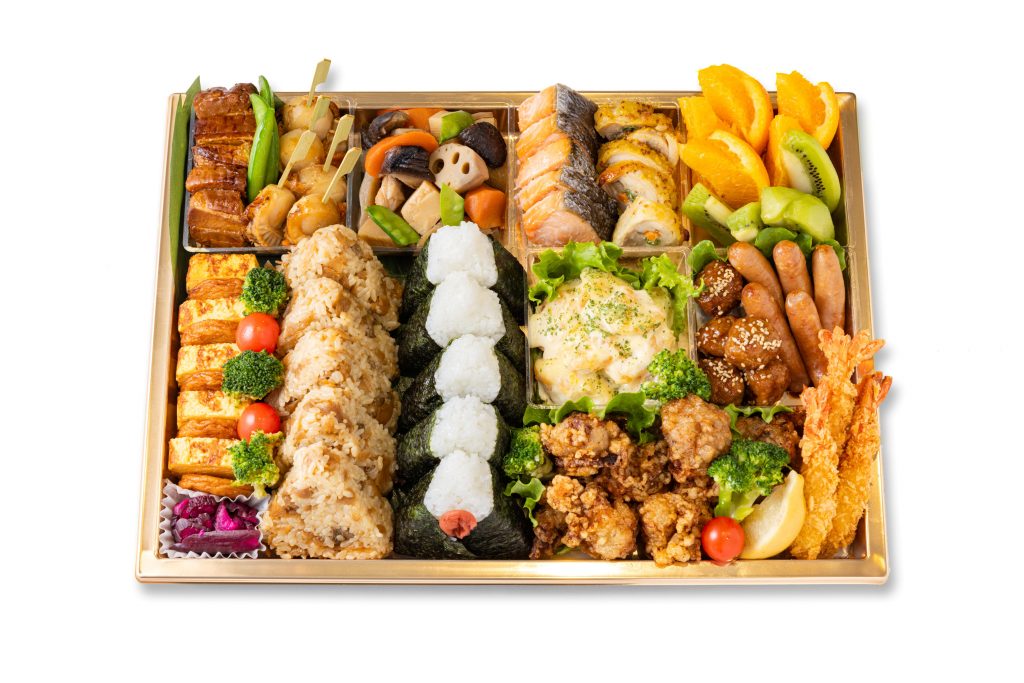 かしわおにぎり、梅おにぎり、エビマヨ、銀鮭の塩焼き、帆立の旨煮、豚角煮、鶏肉と3種野菜巻きのハニーマスタードソース、唐揚げ、エビフライ、ウインナー、肉団子など